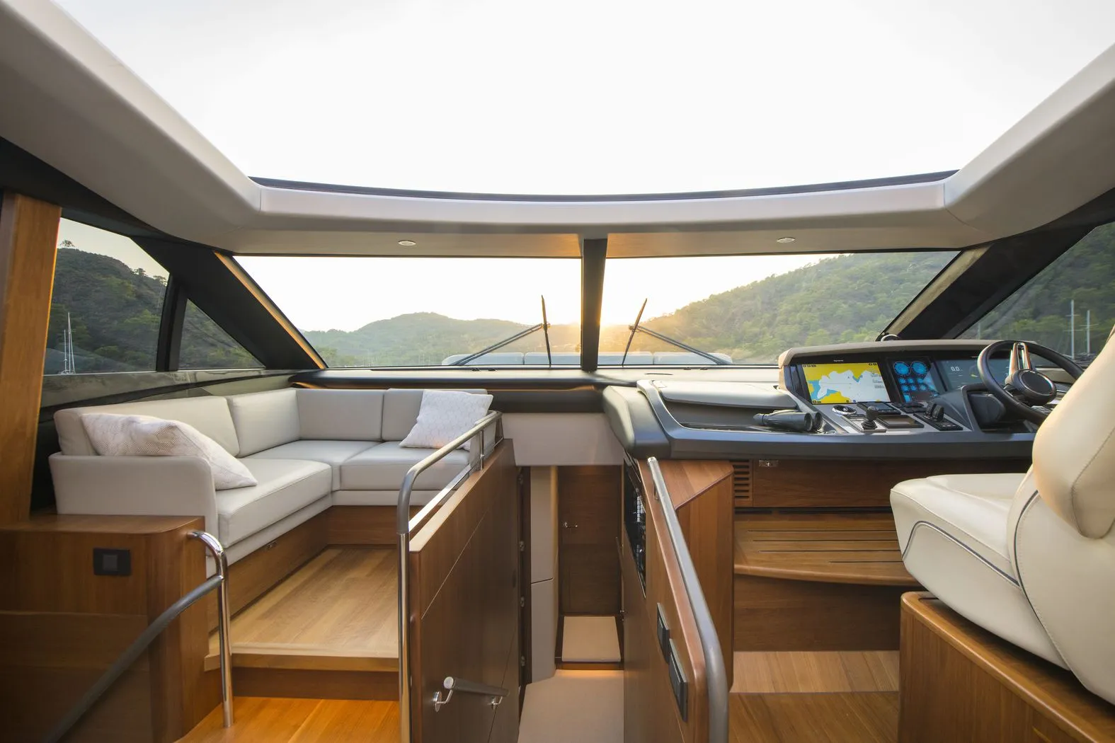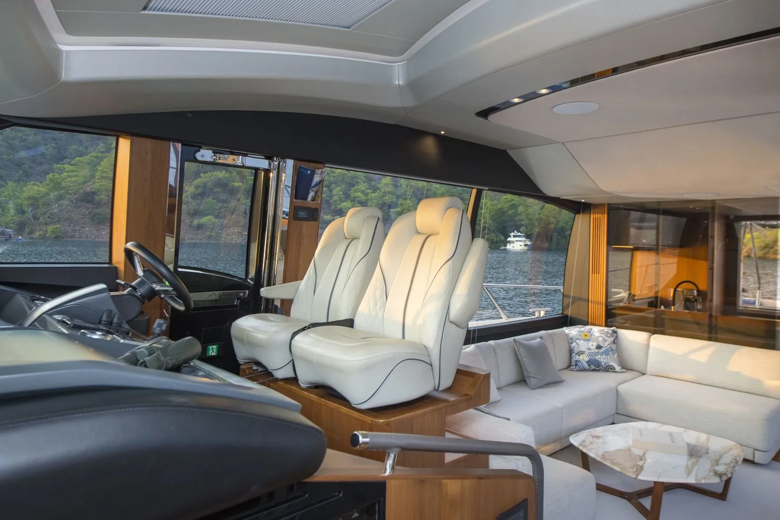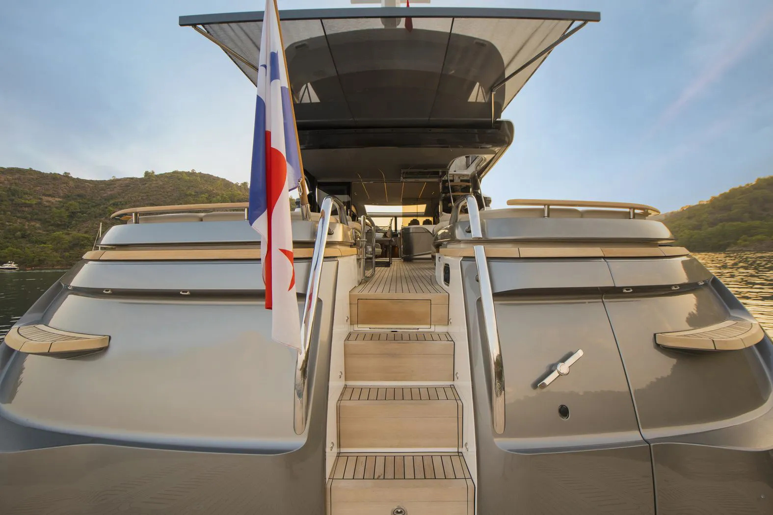 Особое внимание уделено дизайну кокпита и салона: барная стойка в кокпите плавно переходит в камбуз, что обеспечивает гармоничное объединение внешнего и внутреннего пространства яхты. Панорамное остекление салона на главной палубе позволяет наслаждаться потрясающими видами на 360 градусов, создавая ощущение полного единения с окружающей природой.