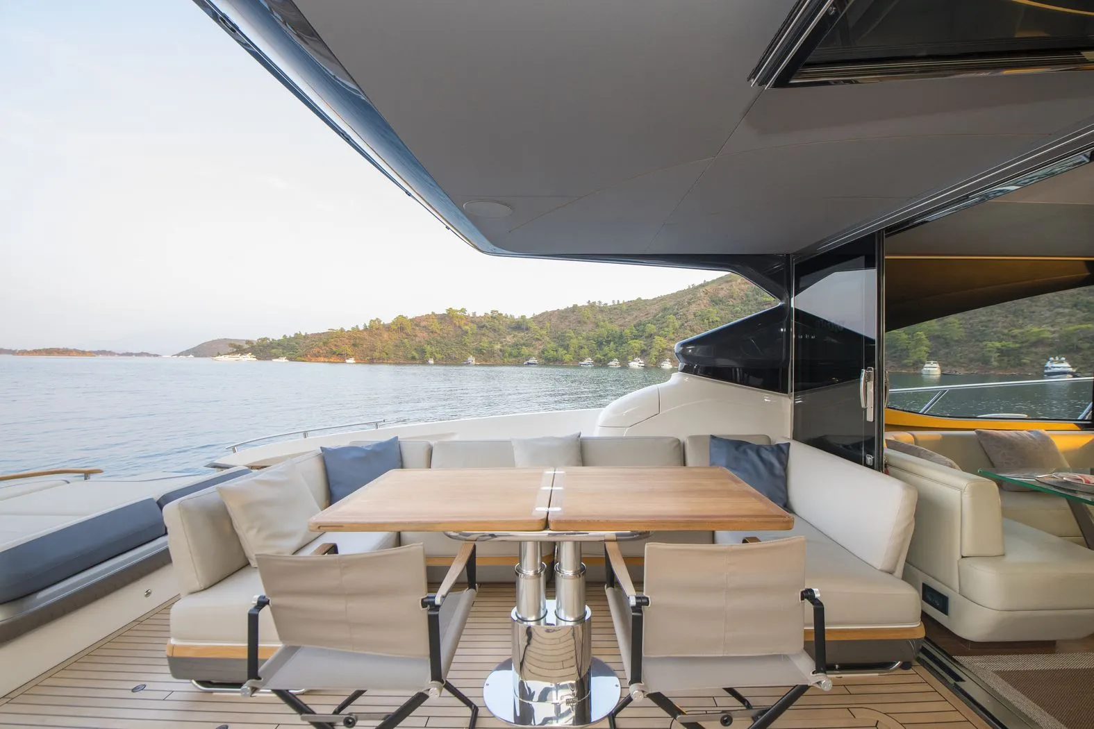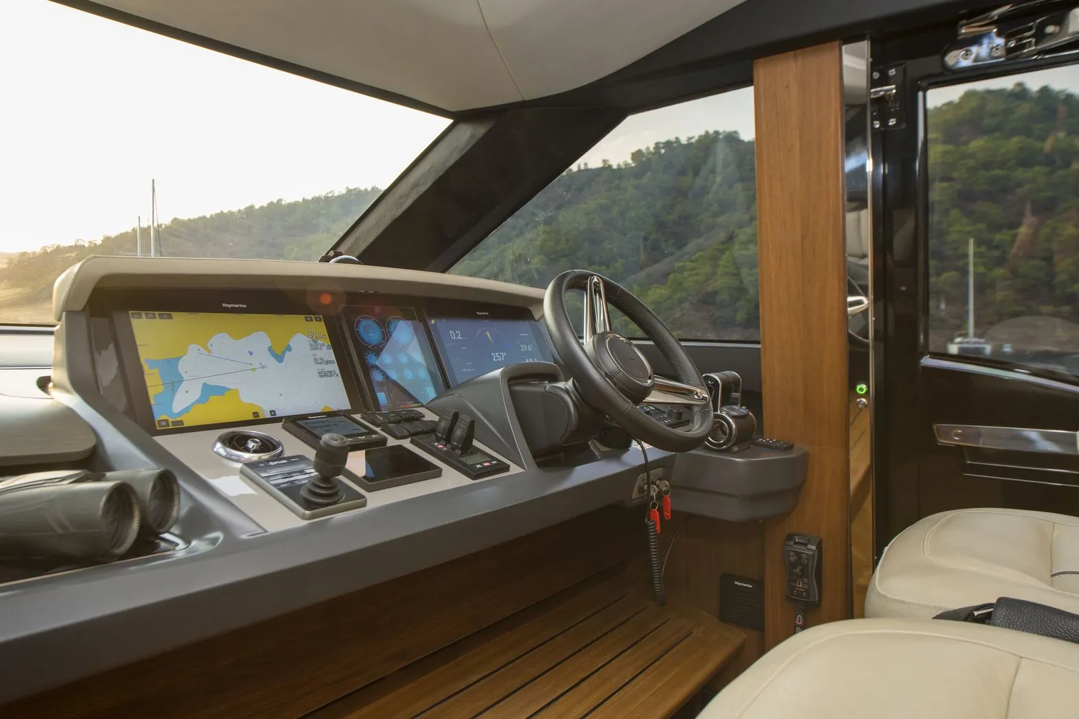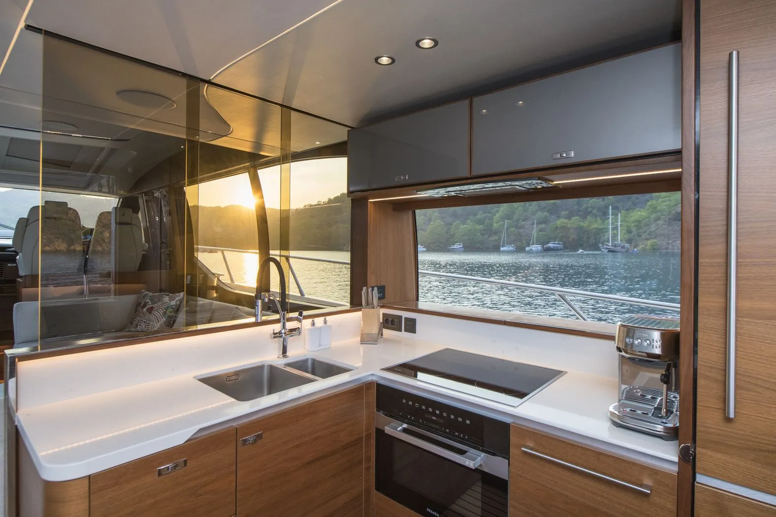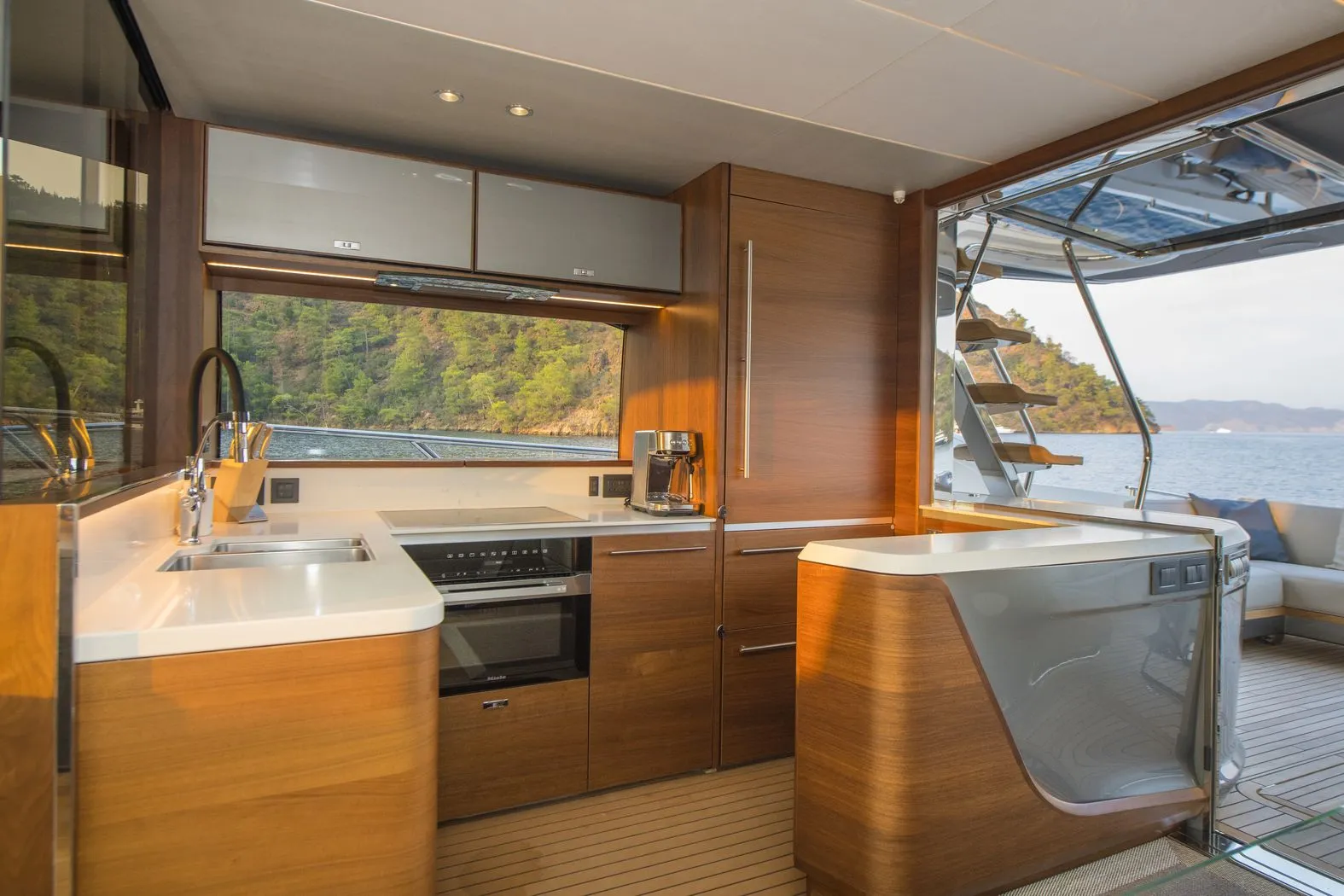 Особое внимание уделено дизайну кокпита и салона: барная стойка в кокпите плавно переходит в камбуз, что обеспечивает гармоничное объединение внешнего и внутреннего пространства яхты. Панорамное остекление салона на главной палубе позволяет наслаждаться потрясающими видами на 360 градусов, создавая ощущение полного единения с окружающей природой.