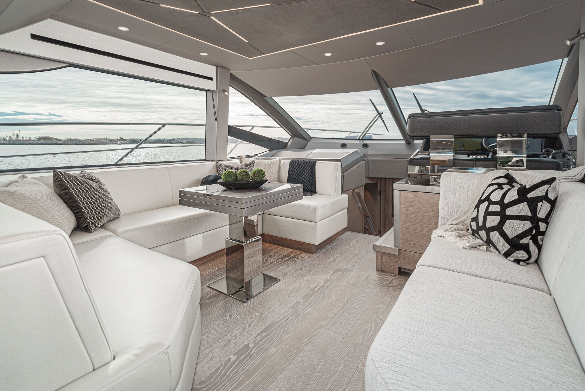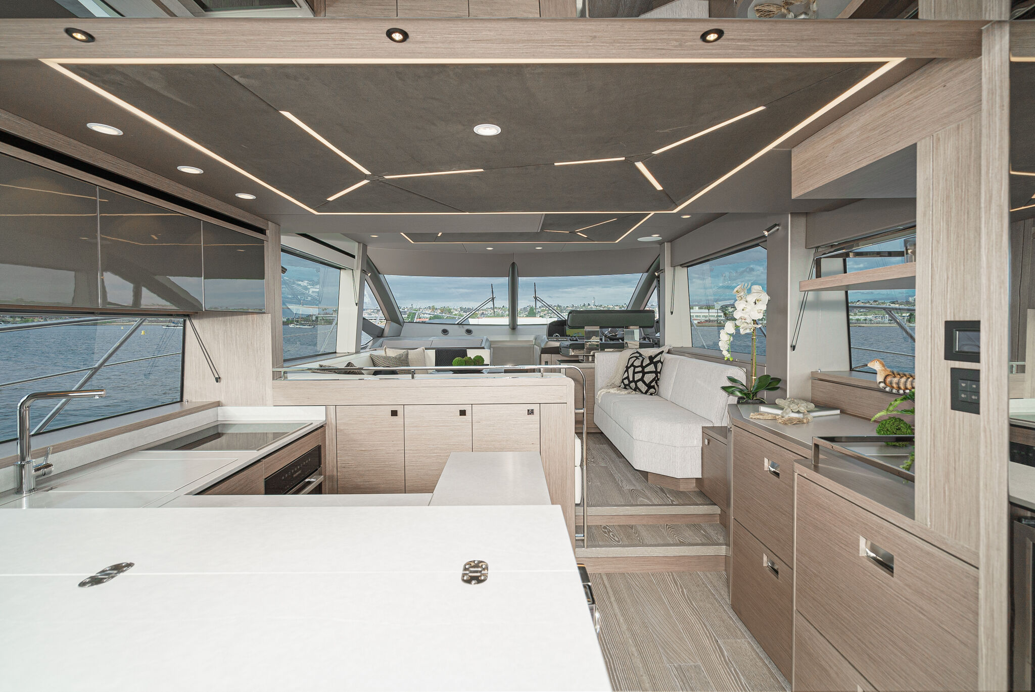 Планировка главной палубы делает эту модель яхты идеальной для развлечений и общения. Особый акцент — на подсветку и детали интерьера. Просторный салон, камбуз в кормовой части, диванная зона у поста управления — продуманная планировка главной палубы позволяет владельцу и гостям легко перемещаться между пространствами для отдыха.
