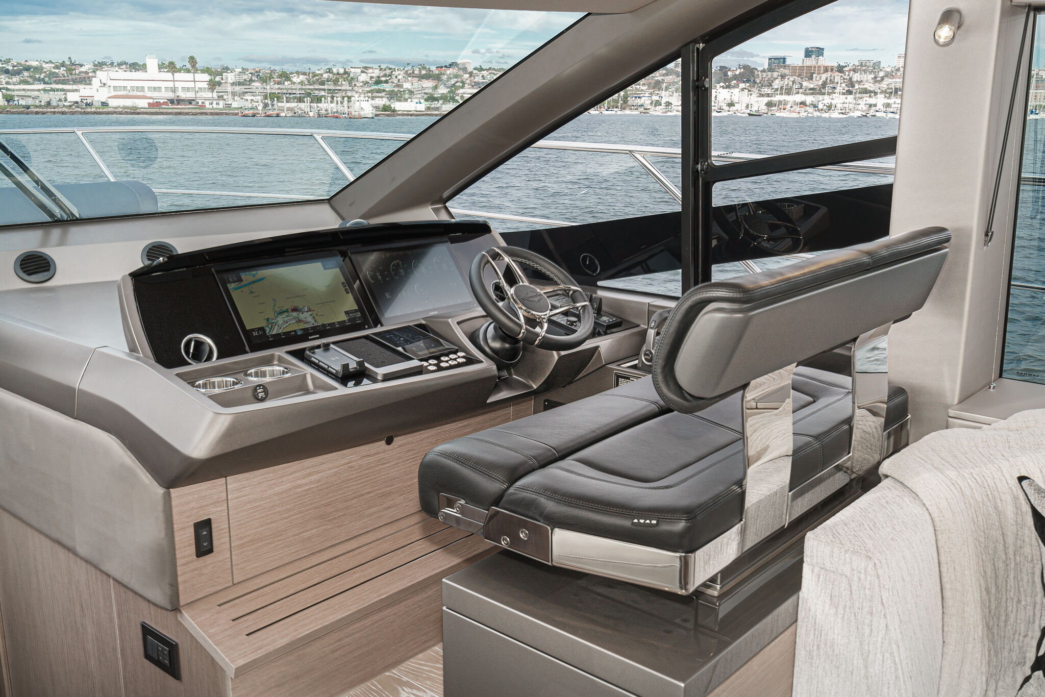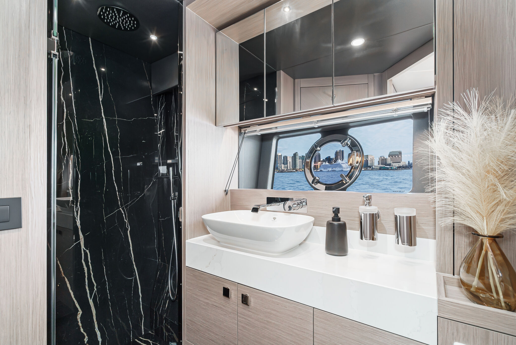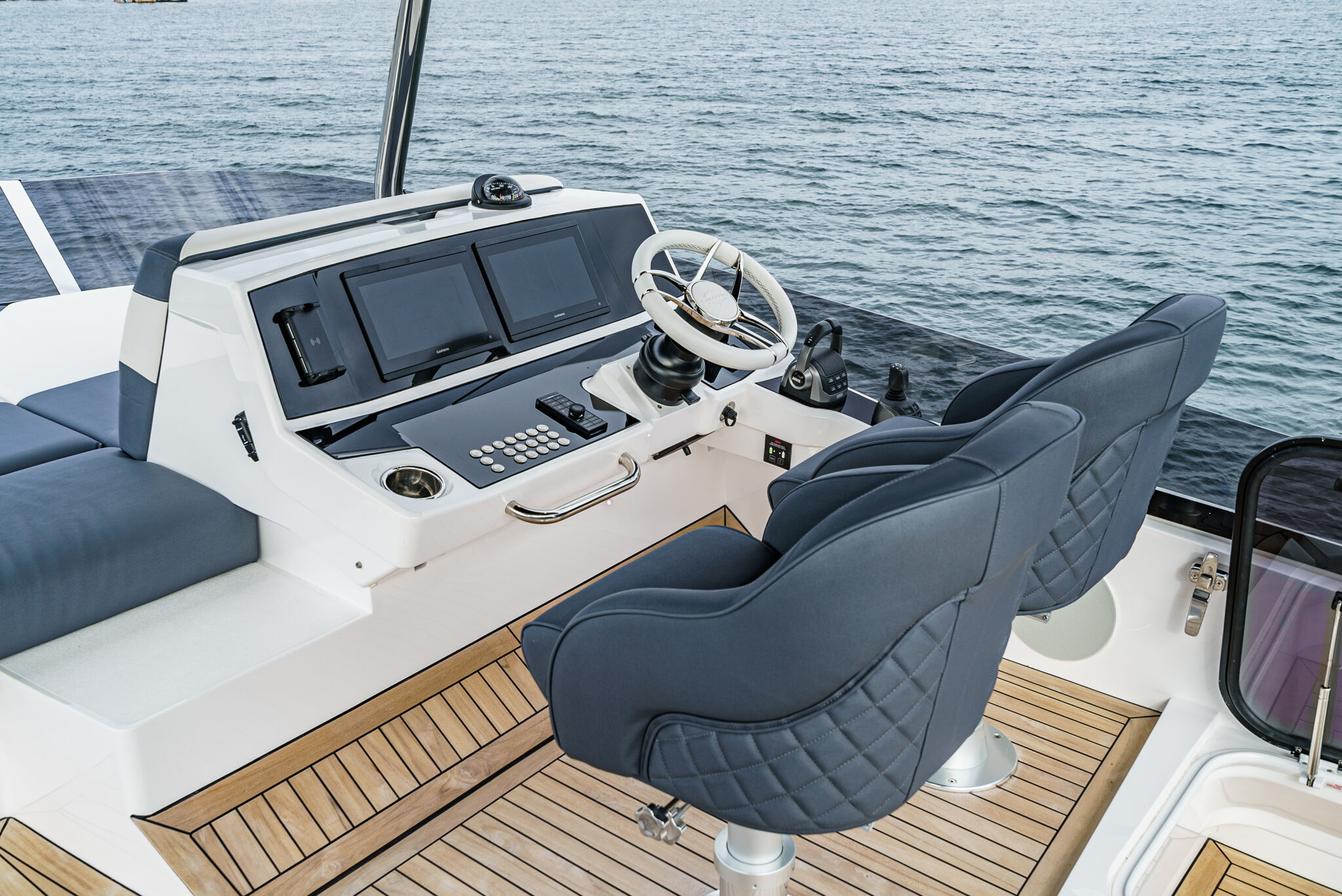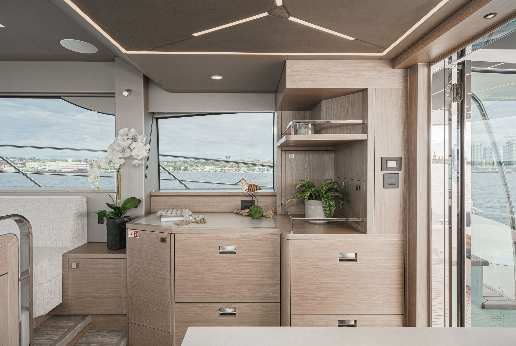 Ключевой особенностью, которая действительно отличает Manhattan 55 от конкурентов, является инновационное электроприводное окно между камбузом и кокпитом. Оно опускается одним нажатием кнопки, а вместе с открытыми кормовыми дверями позволяет полностью объединить внутренние помещения с открытым пространством на палубе. Богато оборудованный камбуз спроектирован и в качестве “островка” для завтрака: здесь есть дополнительные стулья, а под опускающейся рабочей поверхностью — винный холодильник. Удобный диван в салоне, рассчитанный на 6 гостей, дополнен модульной скамьей, которая складывается под постом управления и при необходимости очень удобна для создания дополнительных сидений.