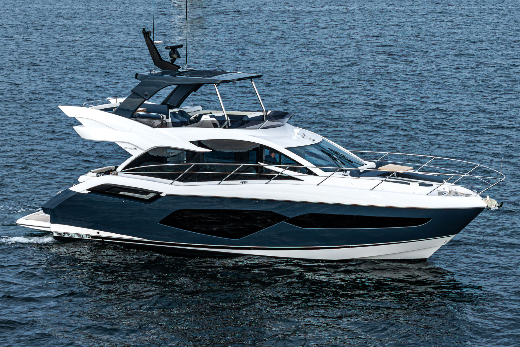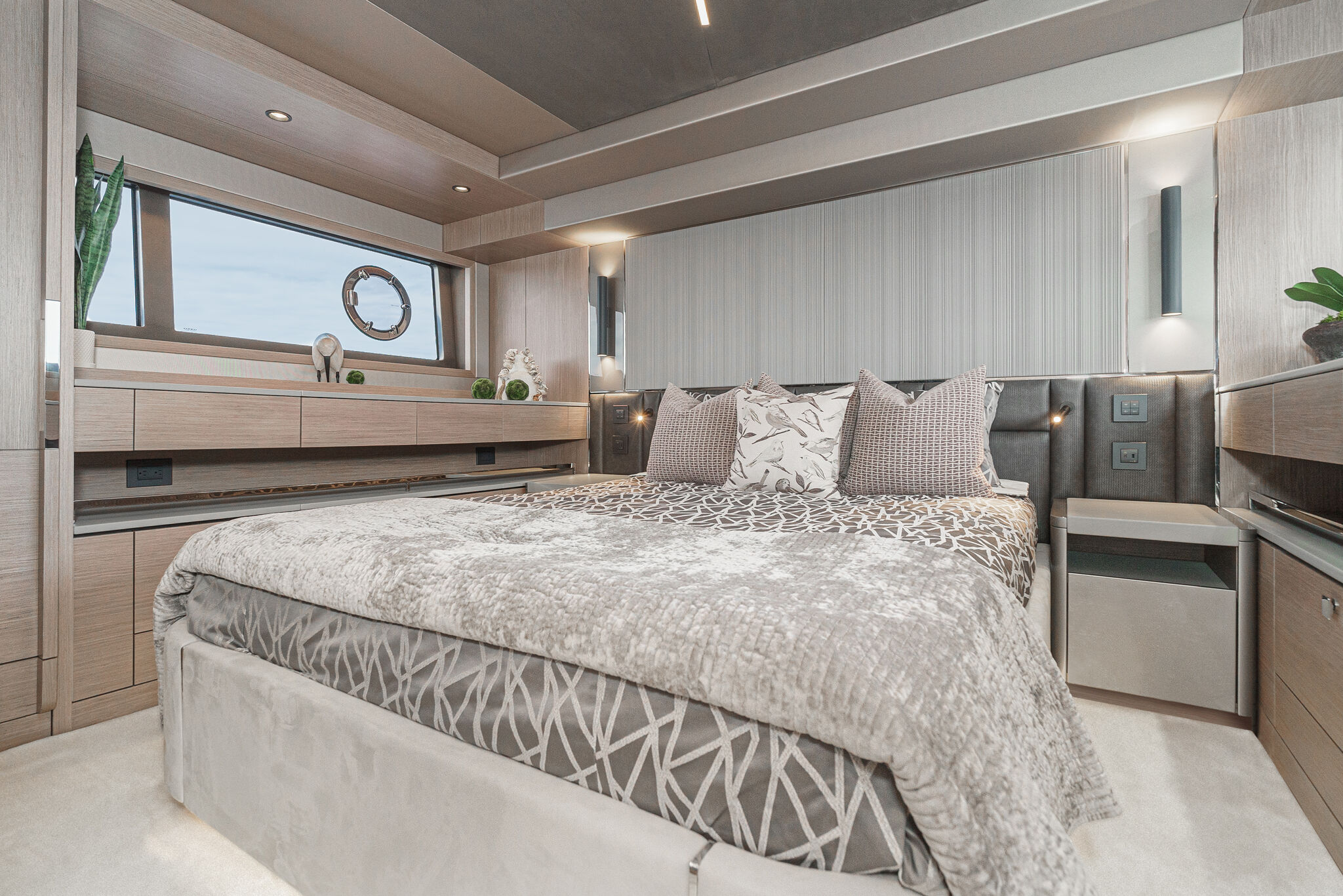 Благодаря расположению камбуза на главной палубе, внизу достаточно места для трех просторных кают. Мастер-каюта с собственной ванной комнатой чрезвычайно велика для яхты такого размера. Большая высота потолка по всему помещению и двуспальная кровать king-size еще раз демонстрируют то внимание, которое Sunseeker уделяет проектированию обитаемого пространства яхты. На выбор заказчика по правому борту можно разместить диван-шезлонг, стол для завтрака или второй шкаф для хранения вещей. Для ванной комнаты были тщательно проработаны новая фурнитура, атмосферная подсветка и места для хранения. А выбор тканей и декоративных материалов, характерный только для линейки Manhattan, как всегда бесподобен и отличается бескомпромиссным качеством.