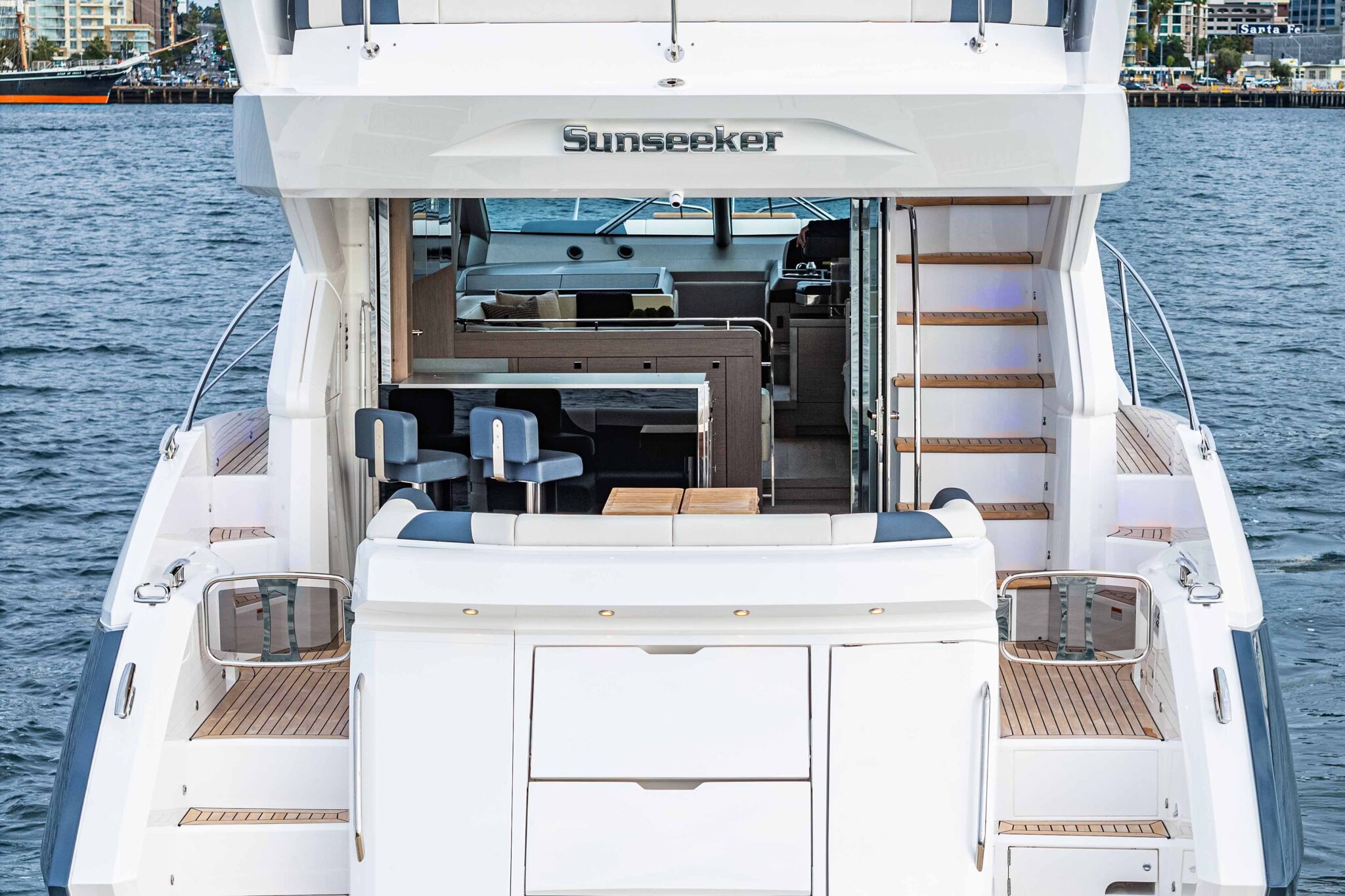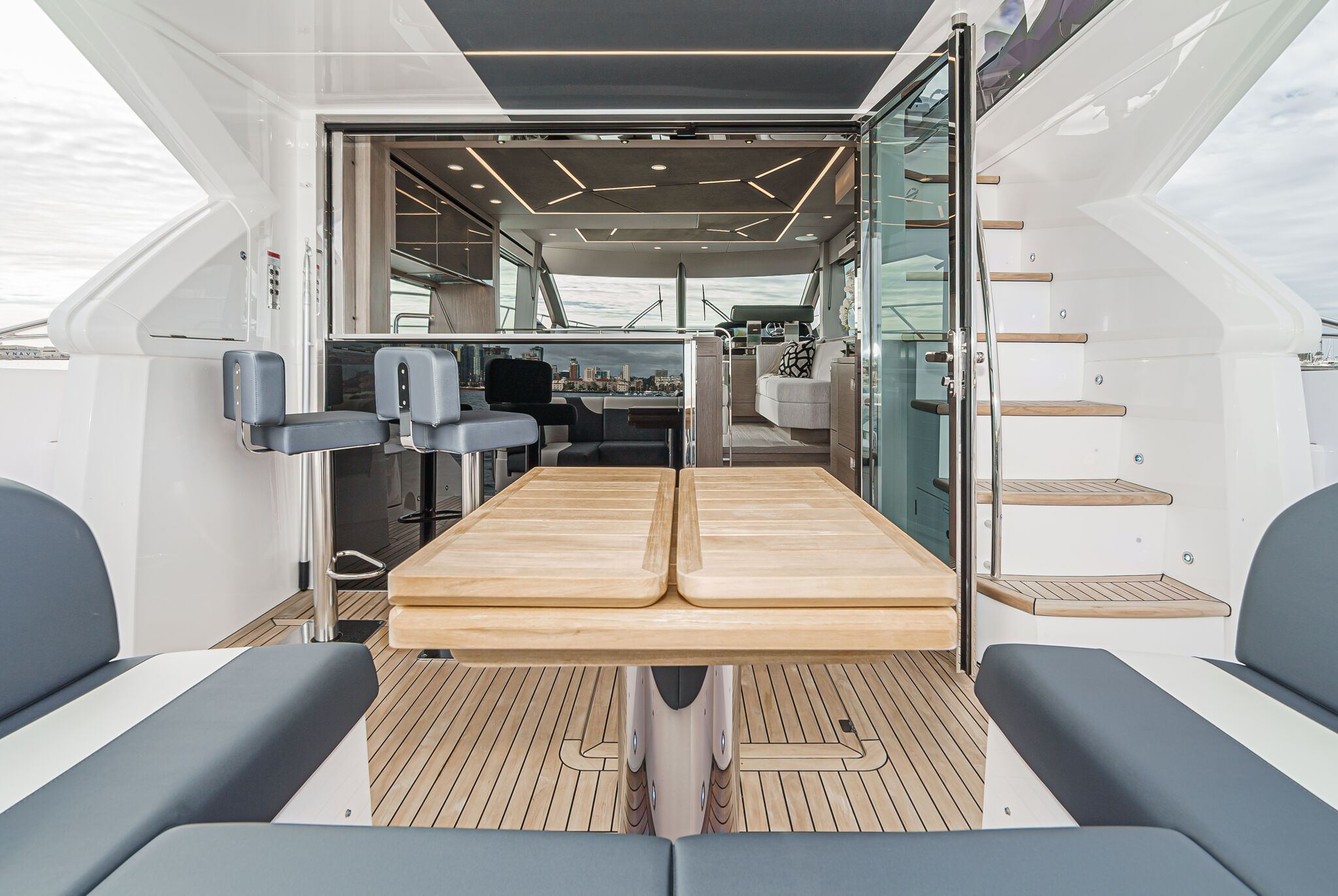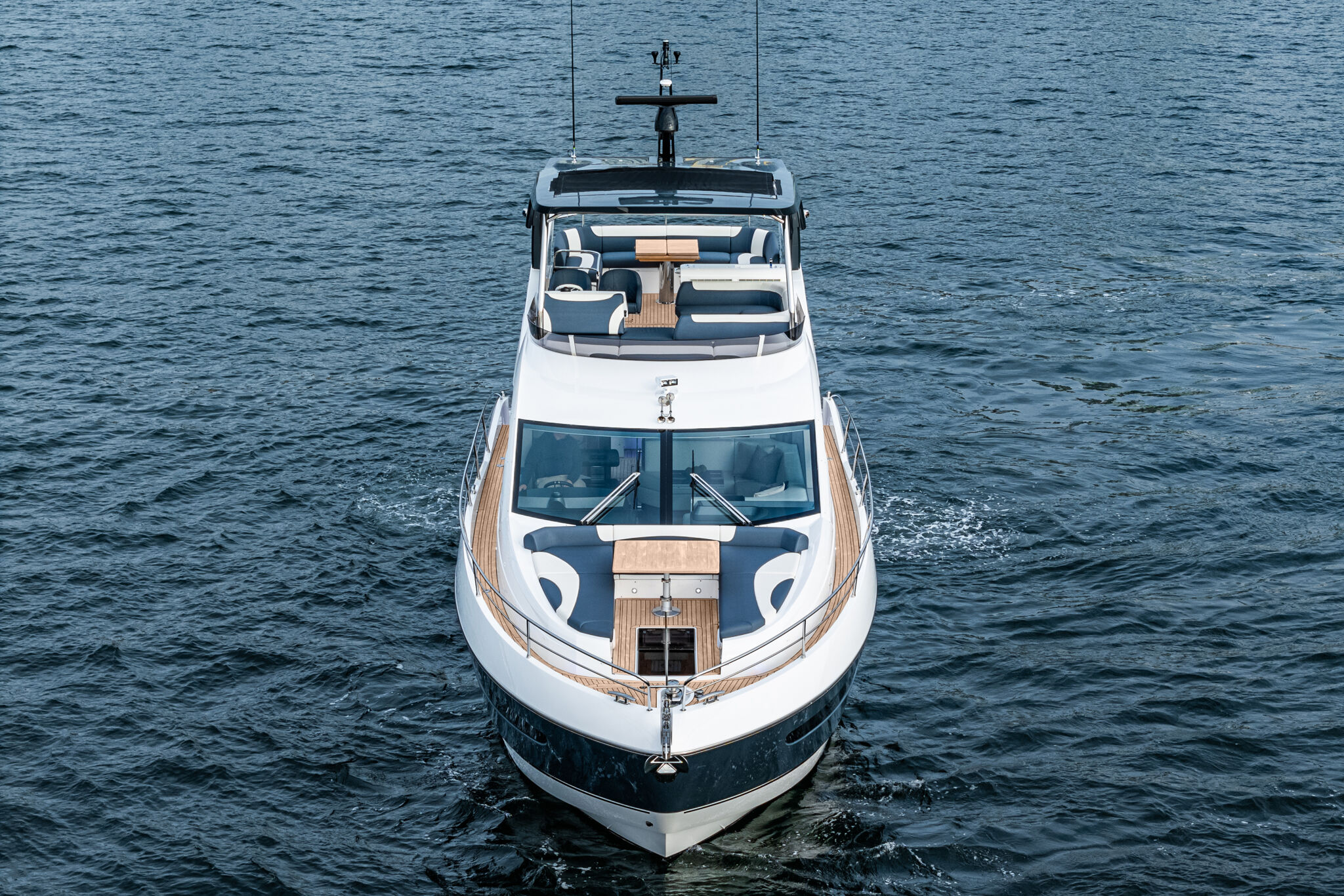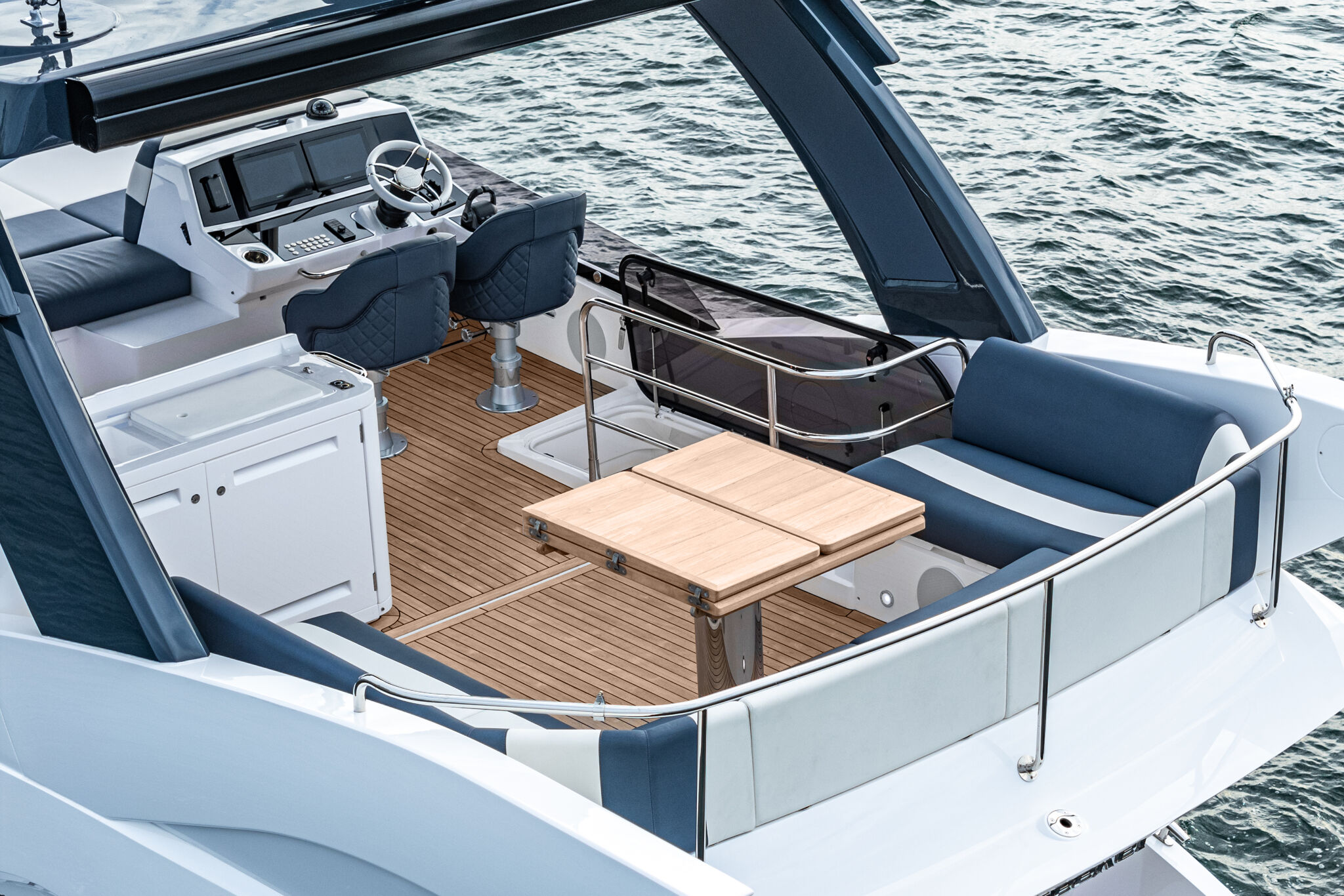 Флайбридж включает в себя просторную зону для загорания в носовой части, вет-бар и фиксированный U-образный кормовой диван, который можно дополнить большим обеденным столом. Все это находится под защитой интегрированного хардтопа (опция). Многофункциональный бар оборудован местом для хранения. Опционально встраиваются гриль и холодильник. А новые экстерьерные материалы позволят владельцам поднять уровень отделки этого великолепного открытого пространства еще выше.
