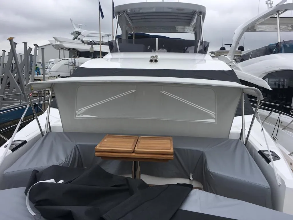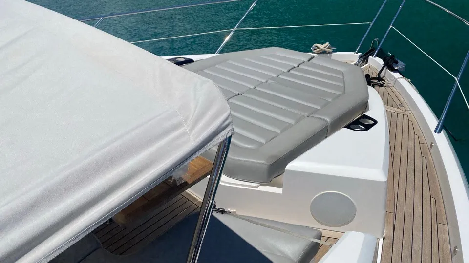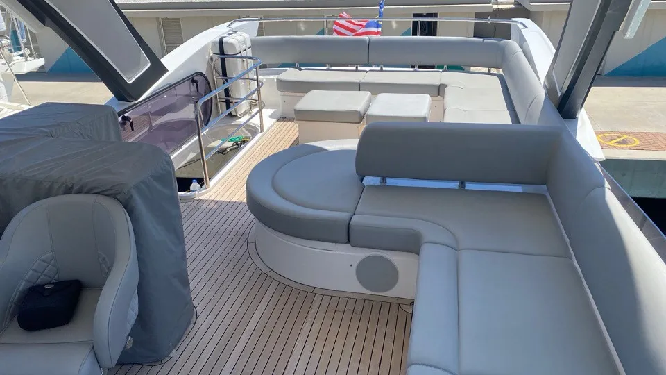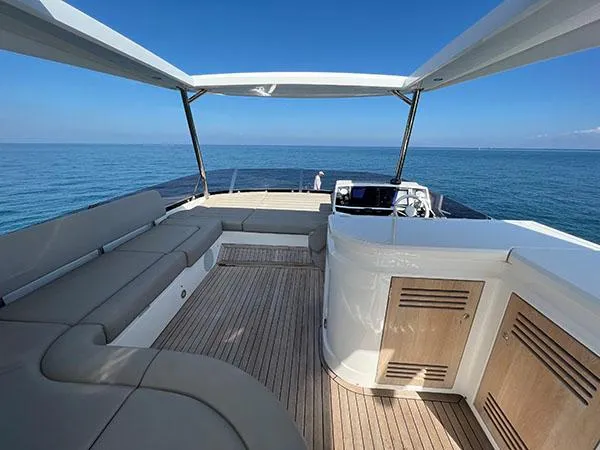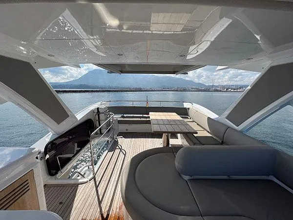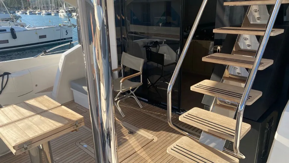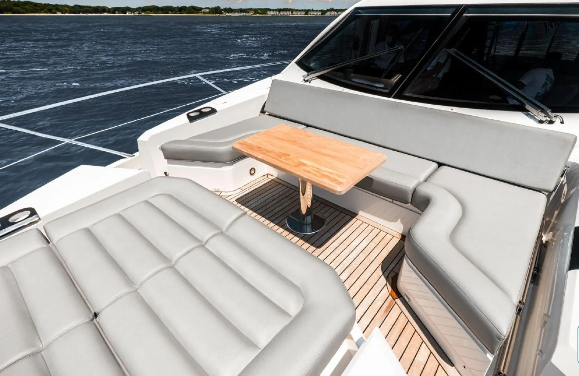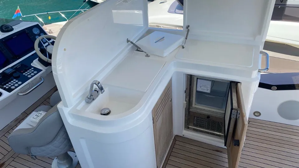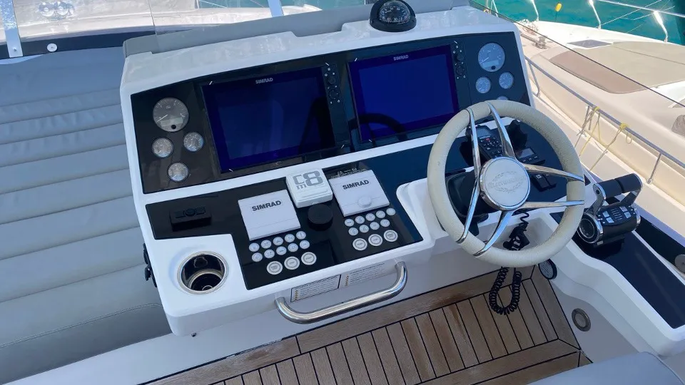 На Sunseeker Manhattan 66 установлены экономичные и надёжные моторы MAN V8 (2 х 1000 л.с.), флайбридж закрыт хардтопом, а кормовая зона на транце образует полноценный бич-клаб за счёт дополнительно установленного пакета опций: электрогриля, душа и откидных сидений.