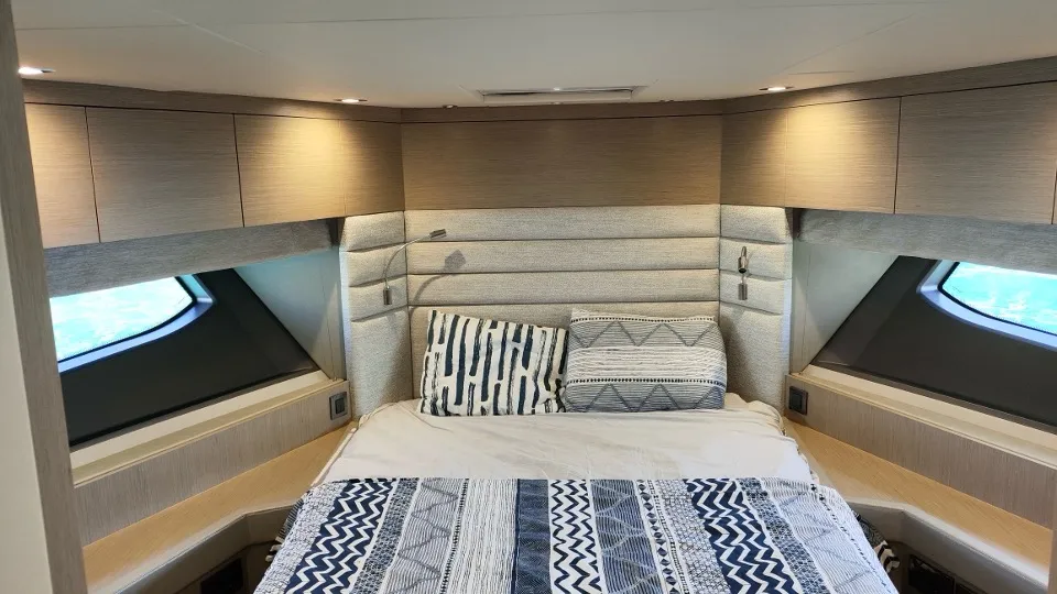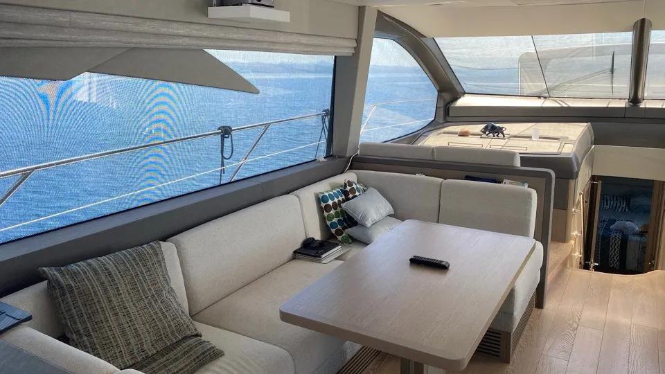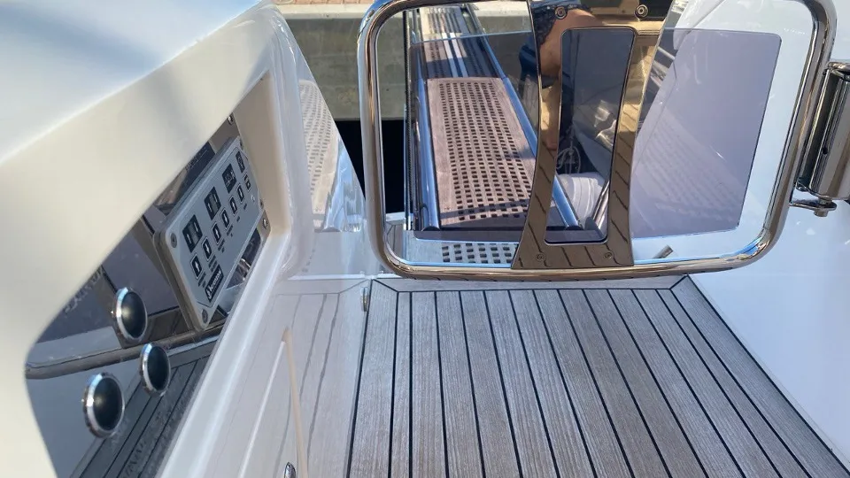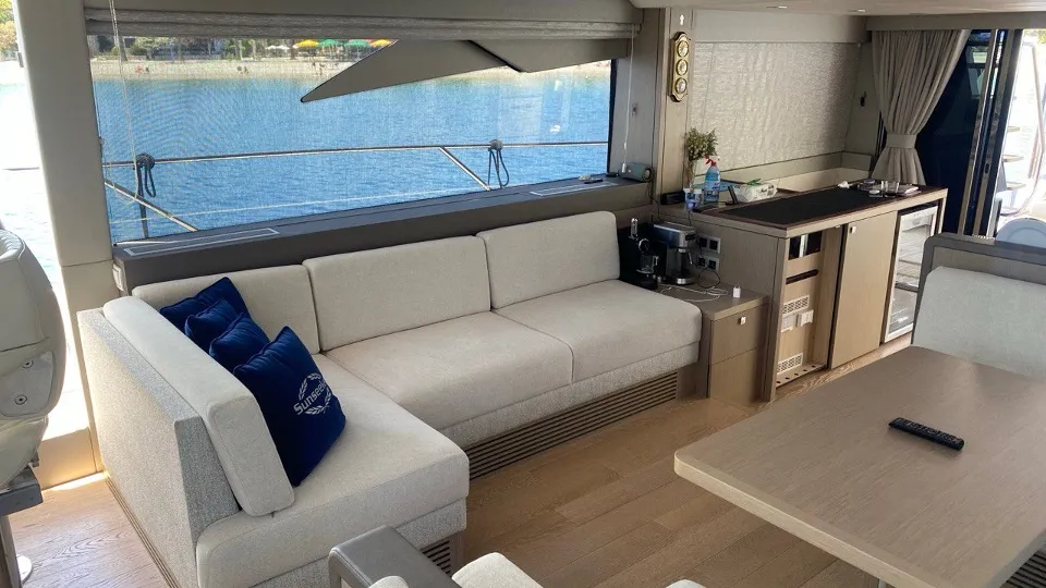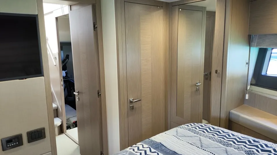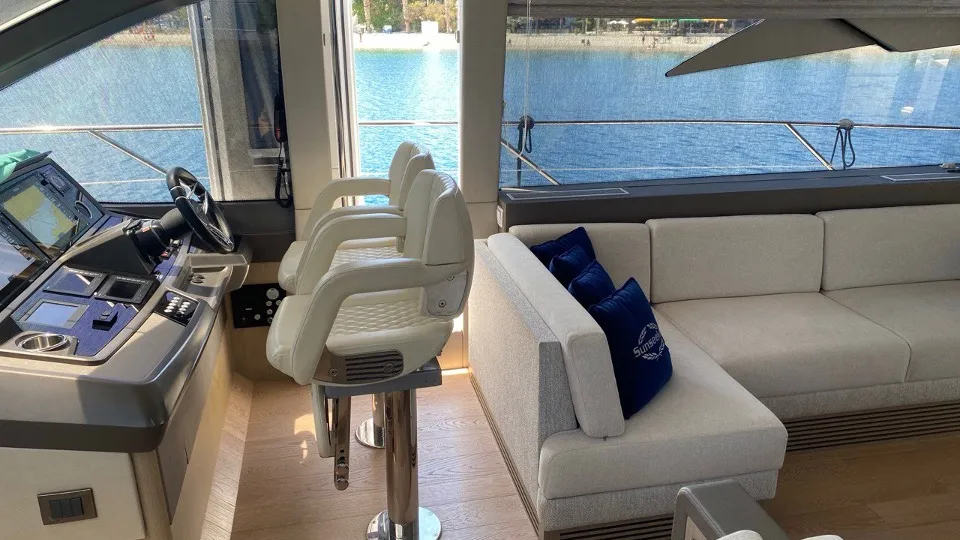 Вариант отделки деревом – благородный серебряный матовый дуб, никакого тяжёлого люкса, всё стильно, изысканно и лаконично. Для комфортной жизни на борту предусмотрены винный холодильник на 20 бутылок, опреснитель на 120 л/ч, а для удобства работы экипажа установлен третий пост управления в корме и камеры видеонаблюдения.