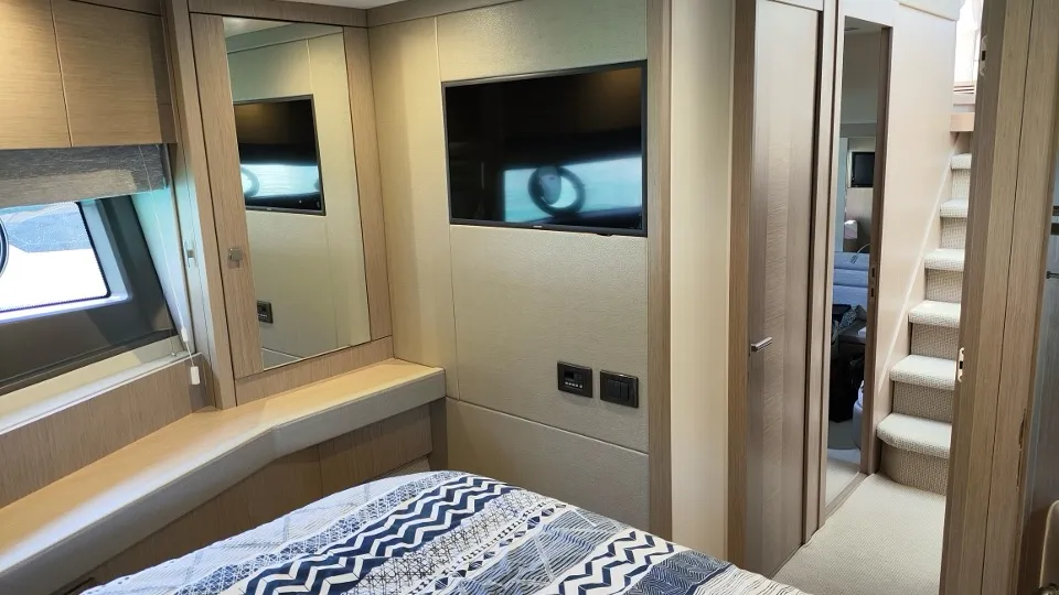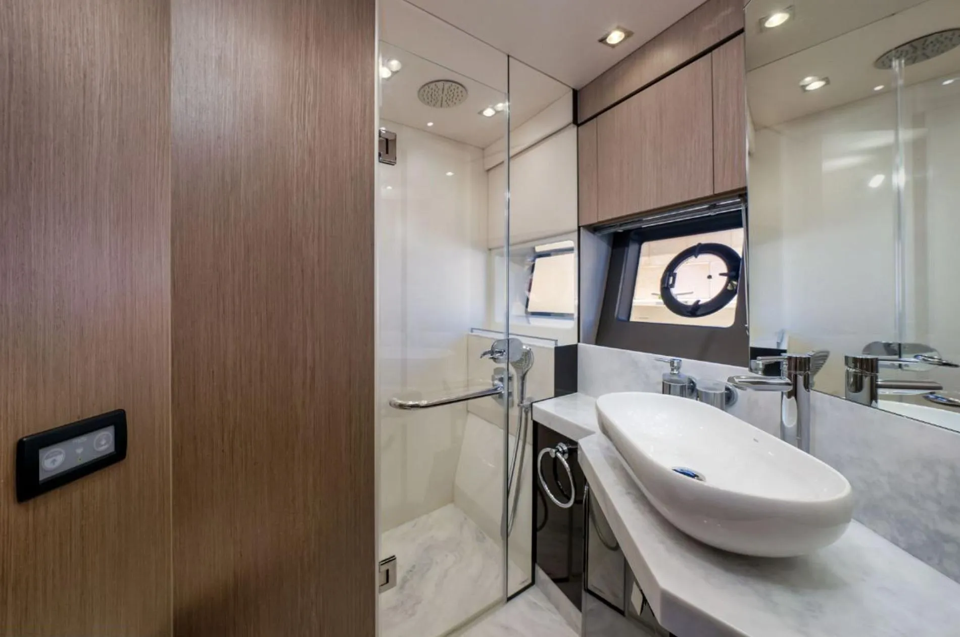 Так же по всей яхте (включая каюту экипажа) установлена тропическая система кондиционирования повышенной мощности и как следствие более мощный генератор на 27 кВт, что также позволило оборудовать Manhattan 66 плавниковым стабилизатором качки Sleipner SPS 55.