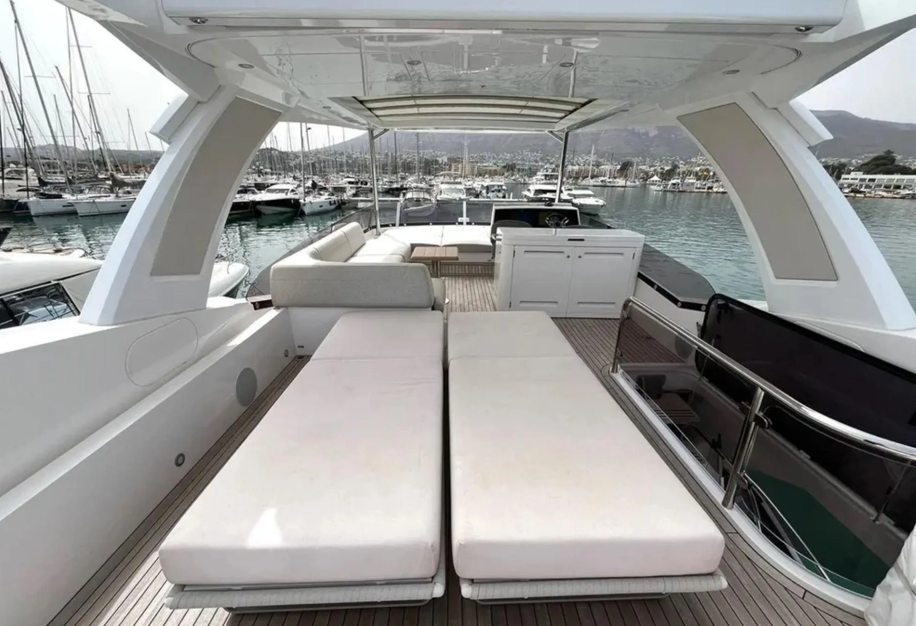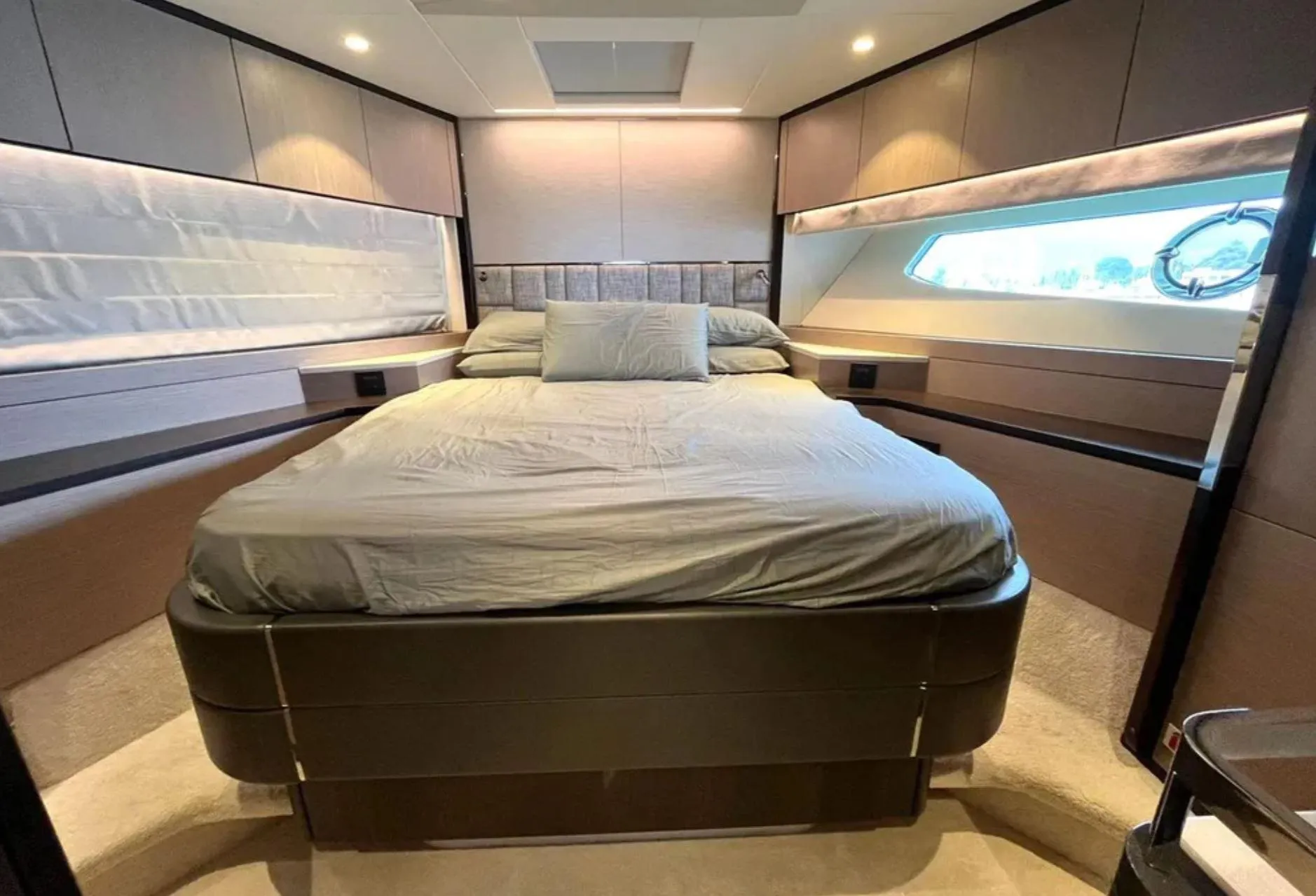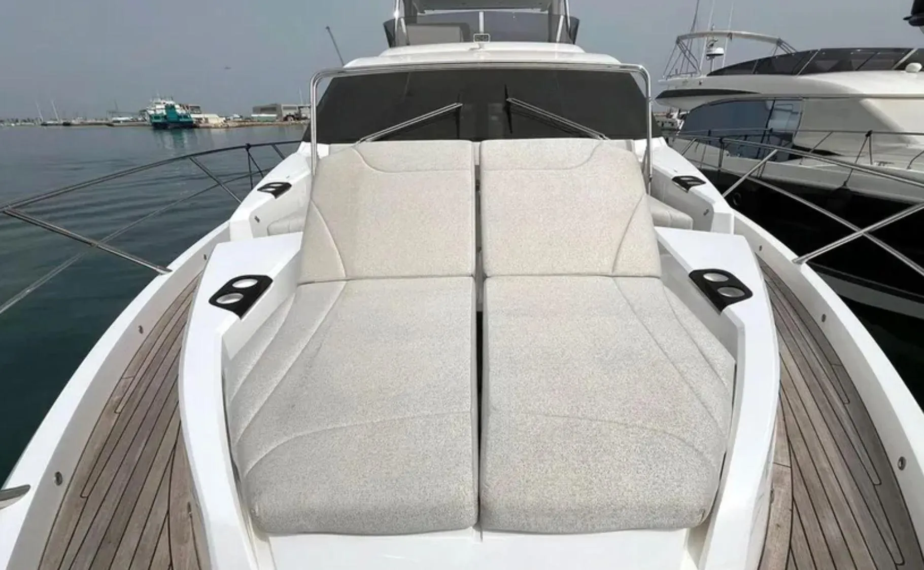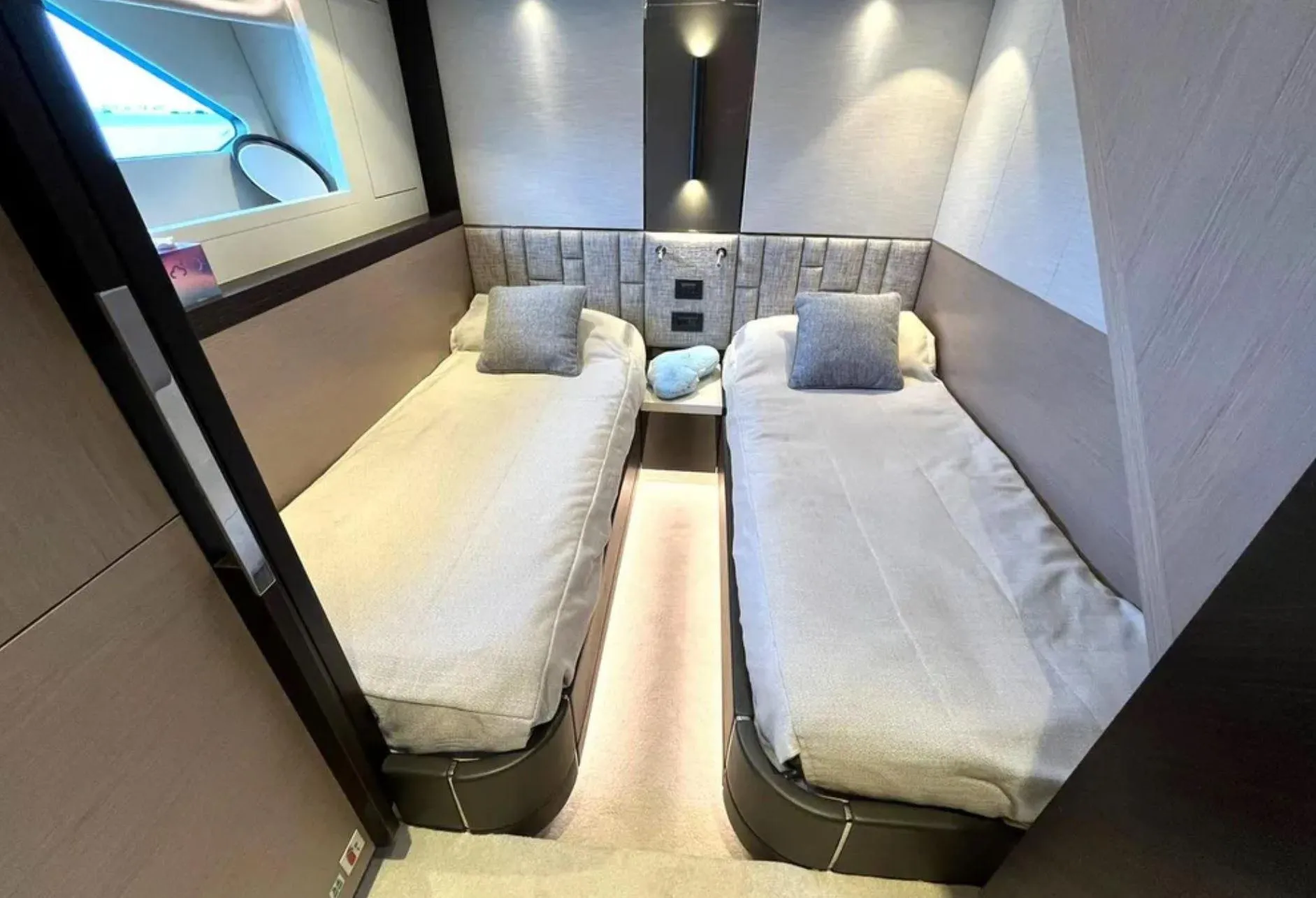 На борту располагаются четыре каюты, включая роскошную мастер-каюту, а также отдельная каюта для экипажа в кормовой части. Пространство для отдыха продумано до мелочей: от салона на главной палубе до флайбриджа и носовой части. Особенно впечатляет кормовая часть яхты с вместительным гаражом для водного снаряжения и многофункциональной гидравлической купальной платформой, создающей идеальное место для активного отдыха и развлечений у воды.