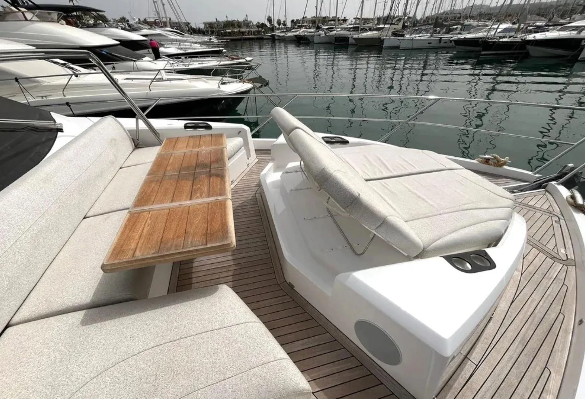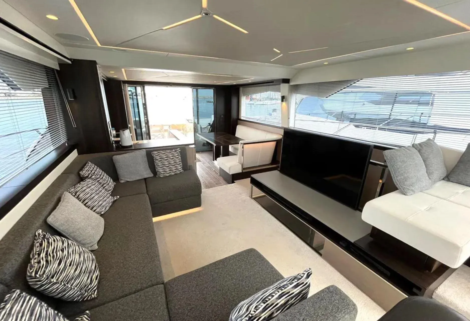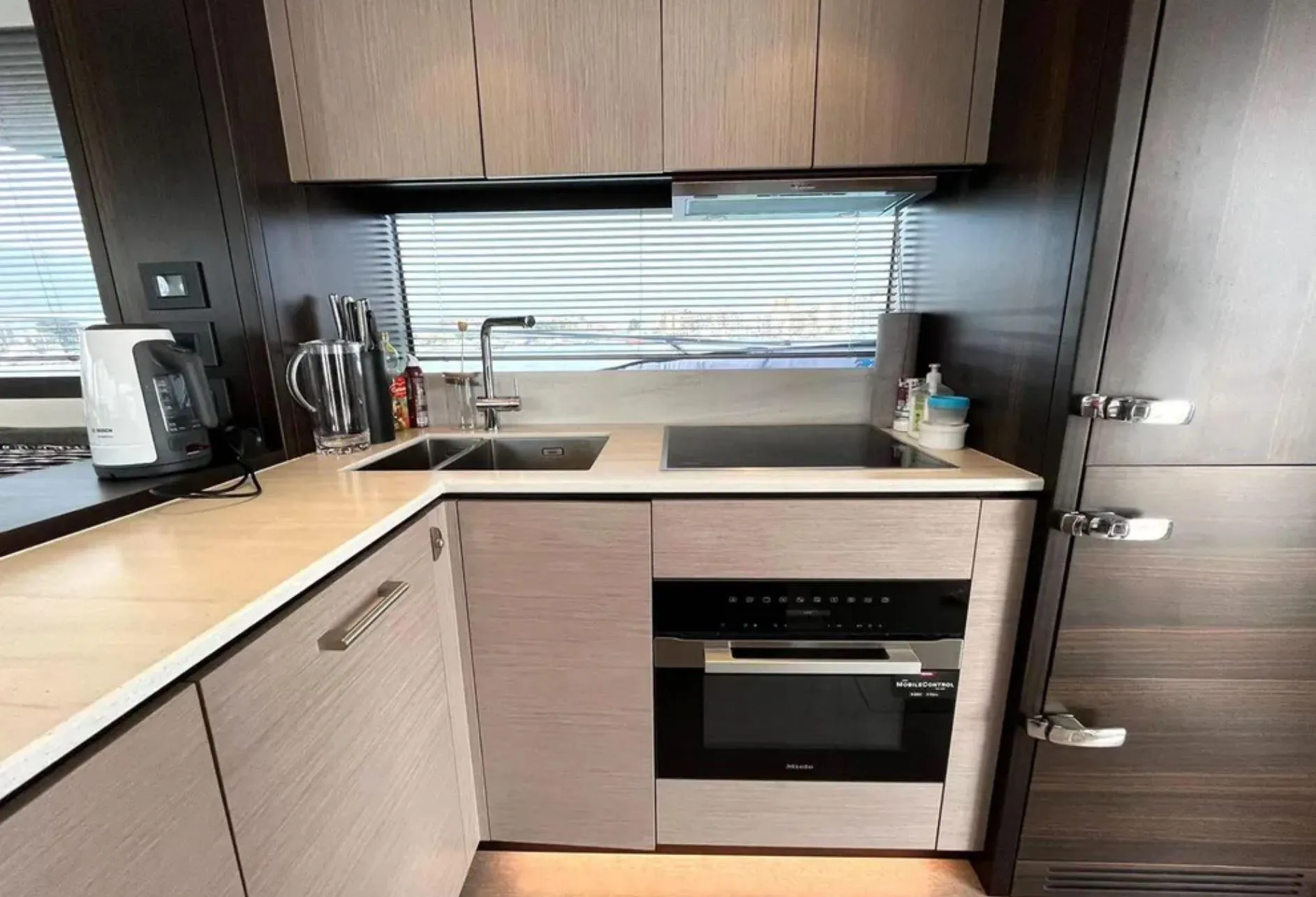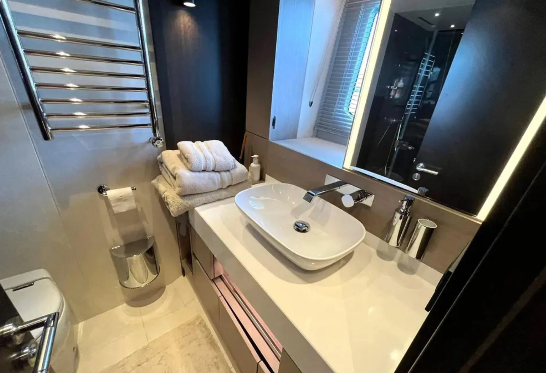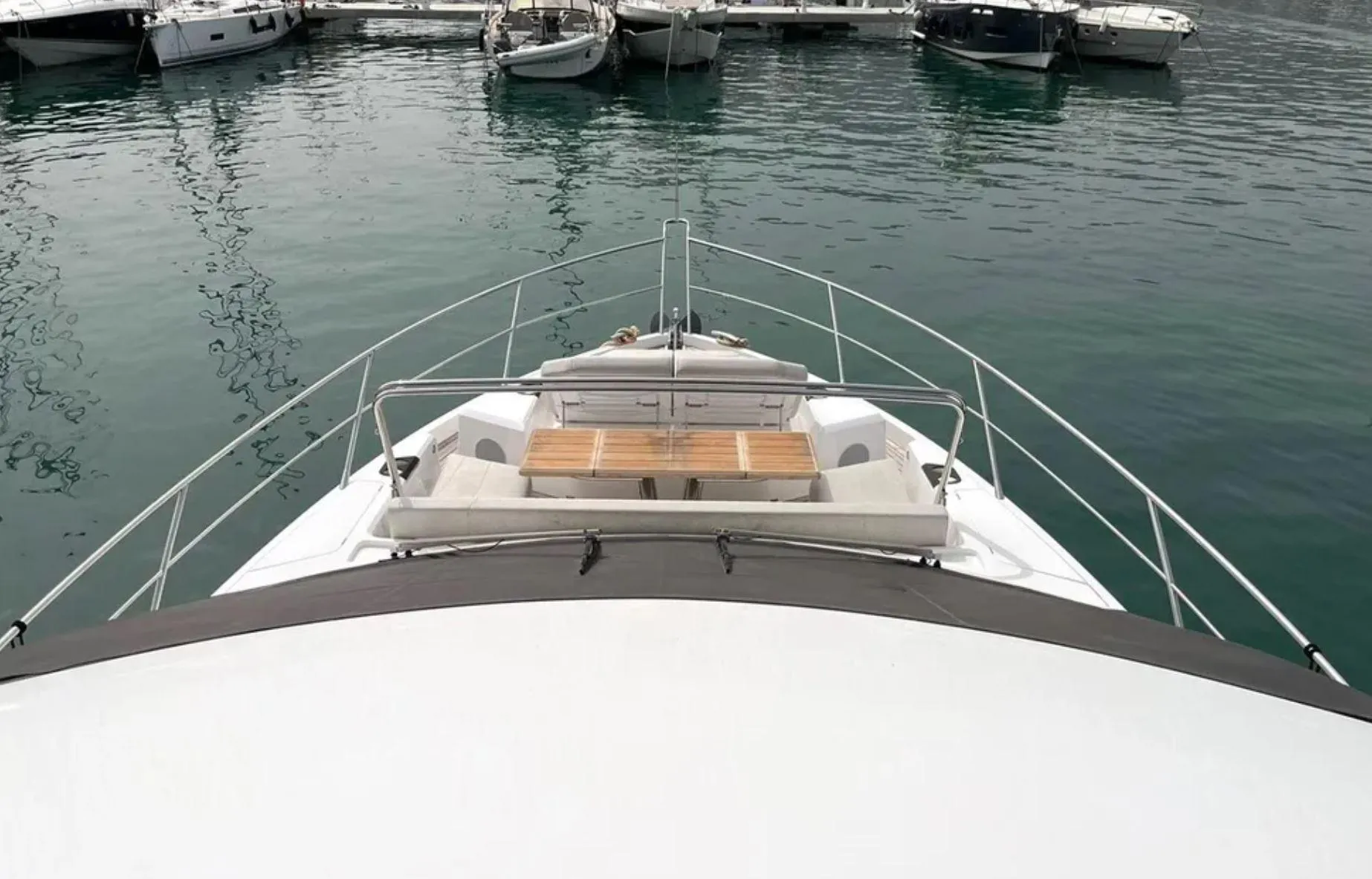 На борту располагаются четыре каюты, включая роскошную мастер-каюту, а также отдельная каюта для экипажа в кормовой части. Пространство для отдыха продумано до мелочей: от салона на главной палубе до флайбриджа и носовой части. Особенно впечатляет кормовая часть яхты с вместительным гаражом для водного снаряжения и многофункциональной гидравлической купальной платформой, создающей идеальное место для активного отдыха и развлечений у воды.